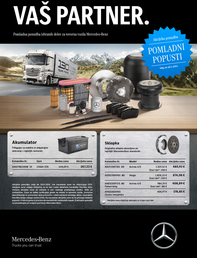 Pomladna akcijska ponudba originalnih delov za tovorna vozila Mercedes-Benz. Izkoristite posebne popuste na akumulatorje, sklopke in druge ključne komponente – kakovost, zanesljivost in ugodne cene do 30. 6. 2026.